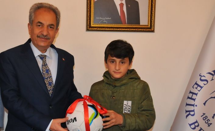 Başkan Akkaya daha sonra Atmatıkla Projesi kapsamında ilk ödülü kazanan Veli Kaçar’a ödülü olan futbol topunu takdim etti.