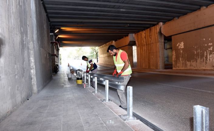 Konya Büyükşehir Belediyesi, trafikte yayaların can ve mal güvenliğini sağlamak için çalışmalar yürütüyor. Şehir genelinde yaya ve araç trafiğinin sorunsuz şekilde akması amacıyla yeni köprülü kavşaklar ve caddeler inşa eden Büyükşehir Belediyesi, bir yandan da vatandaşların talepleri üzerine yeni düzenlemeler yapıyor. Tüm altyapı birimleriyle koordineli bir şekilde çalışmalarını sürdüren Büyükşehir Belediyesi, şehrin önemli ulaşım akslarından biri olan Rauf Denktaş Caddesi üzerinde bulunan Rauf Denktaş Alt geçidi ile Vatan Köprülü Kavşağı altında yayalar için önemli düzenleme yapıyor. Rauf Denktaş Alt geçidini yaya olarak kullanan vatandaşların can güvenliğini sağlamak amacıyla yaya kaldırımına oto korkuluk montajı yapımı başlarken; birkaç gün içinde bitirilmesi planlanan çalışmaların ardından yayalar alt geçitten daha güvenli bir şekilde geçebilecek. Vatan Caddesi ile Beyşehir Caddesini bağlayan hızlı tren alt geçidinde de yayaların geçişine imkan sağlayacak bir düzenleme çalışma başlatan Büyükşehir, yayalar için kaldırım düzenlemesi ve buna bağlı olarak refüjde düzenleme yapacak.