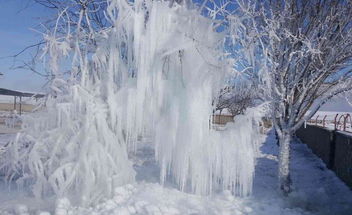 Konya’nın Kulu ilçesinde bir evin bahçesinde bulunan çeşme borusunun patlaması sonrasında söğüt ağacı buz sarkıtları ile adeta kartpostallık görüntüye kavuştu.