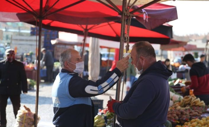 Konya’nın Ereğli İlçe Belediyesi Zabıta Müdürlüğü ekipleri pazara alışveriş için gelen esnaf ve vatandaşları salgına karşı uyararak ateş ölçümü yaparken, toplu taşıma araçları denetlendi.