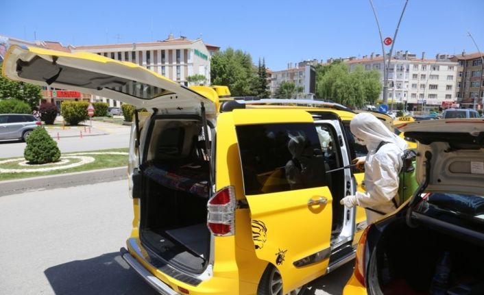 Konya’nın Ereğli İlçe Belediyesi Korona virüs (Covid-19) tedbirleri kapsamında ticari taksileri dezenfekte etmeyi sürdürüyor.
