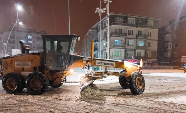 Ereğli Belediyesi ekipleri, kar yağışıyla birlikte gece gündüz tuzlama ve kar küreme çalışmalarını sürdürüyor. Belediye ekipleri, kar yağışının olumsuz etkilerini ortadan kaldırmak adına yoğun çaba sarf ediyor.
