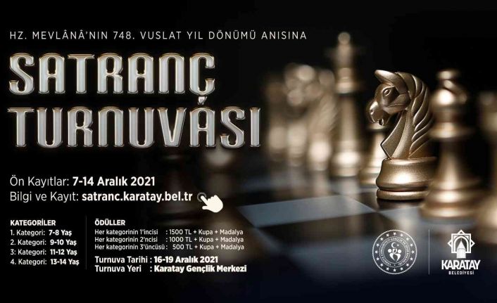 Hazreti Mevlâna’nın 748. Vuslat Yıldönümü anısına düzenlenen ve Karatay Gençlik Merkezi’nde gerçekleştirilecek turnuvaya başvurular, 14 Aralık’a kadar satranc.karatay.bel.tr adresinden alınacak. Turnuvaya Türkiye Satranç Federasyonu lisansına sahip 2021 - 2022 yılı vizesi yapılmış, 2015 ve öncesinde doğan, lisans ili Konya olan sporcular katılabilecek. Turnuvanın ilk turu 17 Aralık Cuma günü saat 14.30’da, son tur yani final ise 19 Aralık Pazar günü gerçekleştirilecek.