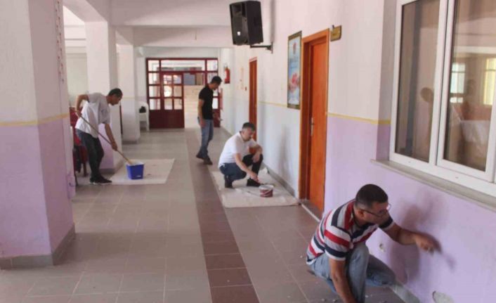 Konya’nın Karapınar ilçesinde 16 derslikli İbrahim Gündüz Anadolu Lisesinin boya badana işlerini okul müdürü, müdür yardımcısı, öğretmenler ve hizmetli birlikte yapıyor.