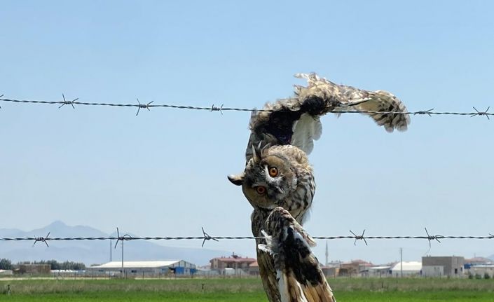 Konya’nın Karapınar ilçesinde tellere takılarak yaralanan kulaklı orman baykuşu, duyarlı çiftçiler tarafından kurtarıldı.
