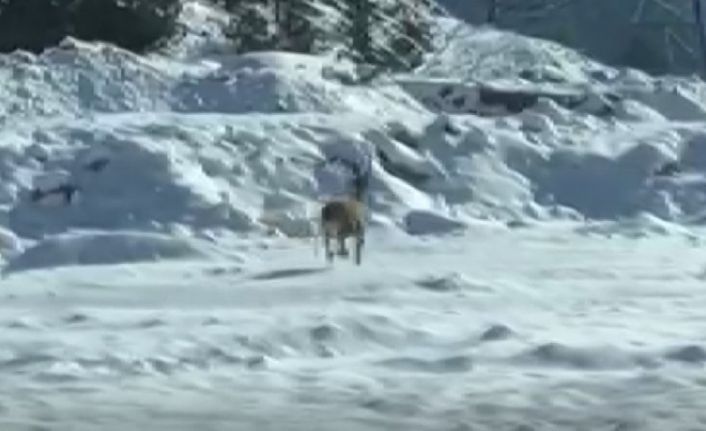 Konya’da sürücüler dondurucu soğuklarda yiyecek arayan yaban hayvanlarını görüntüledi