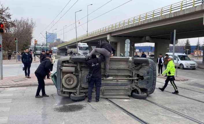 Konya’da tramvay yolu üzerinde iki aracın çarpışması sonucunda meydana gelen trafik kazasında, araçlardan birinin rayların üzerine devrilmesi sonucu tramvay seferleri bir süreliğine durduruldu.