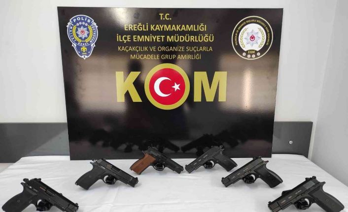 Edinilen bilgiye göre, Ereğli İlçe Emniyet Müdürlüğüne bağlı polis ekipleri şüphe üzerine bir araca dur ihtarında bulundu. Şüphelilerin dur ihtarına uymayarak kaçması üzerine kovalamaca yaşandı. Bir süre yaşanan takibin ardından durduran araçta bulunan 4 kişi gözaltına alındı. Polis ekipleri, kovalamaca sırasında şüphelilerin araçtan attığı 6 adet tabancayı bularak el koydu. Gözaltına alınan 4 şüphelinin evinde yapılan aramalarda 4 kutu tabanca fişeği ele geçirildi. Emniyetteki işlemleri tamamlanan 4 şüpheli, sevk edildikleri adliyede çıkartıldıkları mahkemece tutuklanarak cezaevine gönderildi.