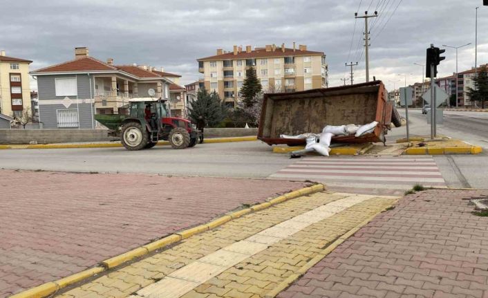 Konya’nın Kulu ilçesinde seyir halindeki traktörün yerinden çıkan römorku refüjde bulunan trafik ışıklarının bulunduğu direğe çarparak devrildi.