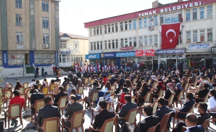 Kutlama Yunak Belediye Meydanında saygı duruşunda bulunulması ve İstiklal Marşının okunmasıyla başladı. Öğrencilerin şiir okumasının ardından, Yunak Kaymakamı Fatih Kurt günün anlam ve önemini belirten konuşmayı yaptı. Kutlamalara Yunak Kaymakamı Fatih Kurt, Yunak Belediye Başkanı Abdullah Emre Demirhan, resim kurum amirleri, okul müdürleri, öğretmenler ve vatandaşlar katıldı.