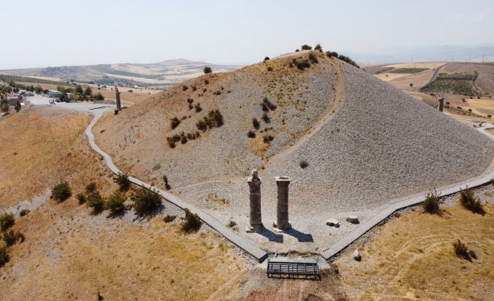 Adıyaman’ın Kahta ilçe merkezine yaklaşık 10 kilometre uzaklıkta bulunan Karakuş Tümülüsü Kommagene Krallık Ailesi’nin kadınlarına ait bir anıt mezar olduğu biliniyor. Yaklaşık 20 metre yüksekliğindeki tümülüsün güneyinde dikili bulunan sütun üzerindeki kartal, doğusunda boğa ve aslan, batısında ise Kommagene Kralı I. Antiochos’un Kral II. Mithridates’in kız kardeşi Laodike ile tokalaşma kabartması yer alır. Doğu Terasında bulunan boğa ve aslan başları yok olmuş. Sütun üzerindeki yazıttan anıt mezarın Kral Antiochos’un eşi İsias, kızı Antiochis ve torunu Aka’ya ait olduğu anlaşılmaktadır.