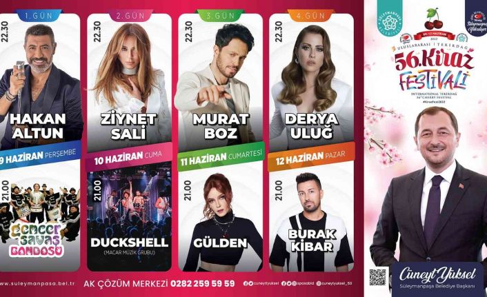 Tekirdağ Süleymanpaşa Belediyesi tarafından organize edilen ve bu yıl 56’ncısı düzenlenecek olan Uluslararası Tekirdağ Kiraz Festivali, 9-12 Haziran 2022 tarihleri arasında gerçekleştirilecek. Çok sayıda etkinliğe ev sahipliği yapacak olan 56. Uluslararası Tekirdağ Kiraz Festivali’nin programı belli oldu.