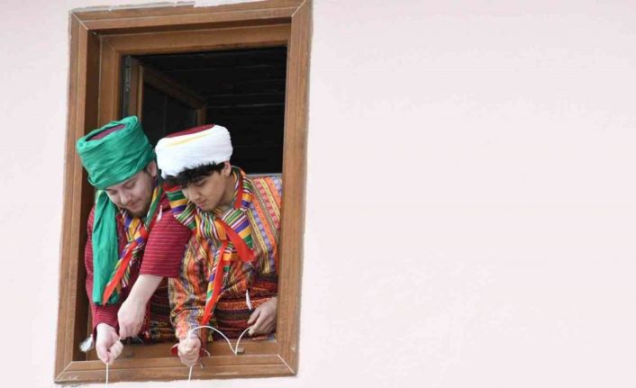 Bilecik’te 700 yıllık Osmanlı geleneği olan minare şerefesinden aşağıda bekleyen çocuklara sepetle şeker sarkıtma geleneği bir kez daha gün yüzüne çıkarıldı.