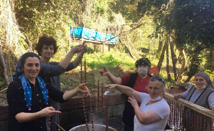Artvin’de kadınları imece usulü köme pestil yapımına başladı. Ceviz ve fındıklar ince işçilikle iplere geçilirken, geleneksel yöntemlerle birçok aşamadan geçtikten sonra sofralarda yerini alıyor.