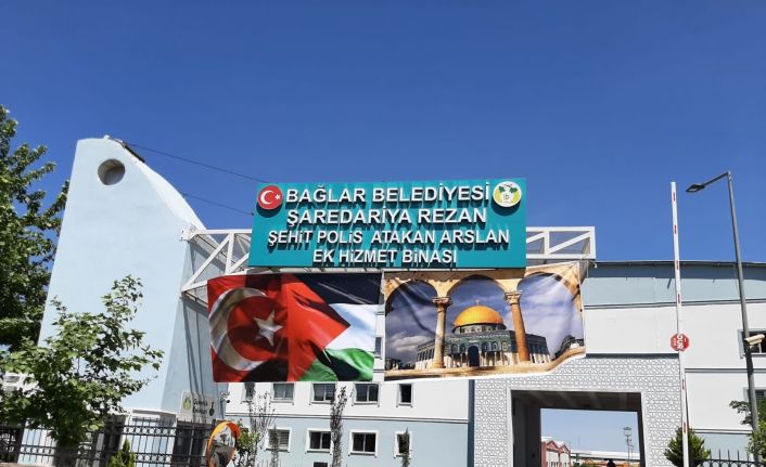 Diyarbakır’ın Bağlar İlçe Belediyesi, İsrail’in saldırılarını protesto etmek ve Filistin halkına destek olmak amacıyla hizmet binasının girişine Türk bayrağı, Filistin bayrağı ve Mescid-i Aksa’nın resminden oluşan dev pankart astı.