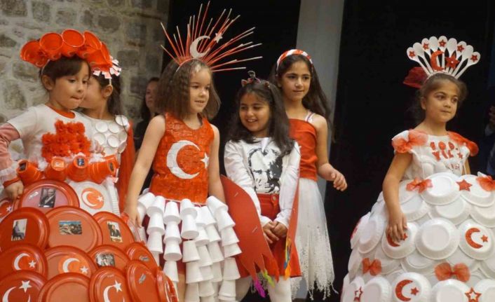 Edirne’de, Cumhuriyet’in 100. yılı kutlamaları çerçevesinde Ticaret Borsası İlkokulu öğrencileri, geri dönüşüm malzemelerinden hazırlanan kıyafetlerle defile yaptı. Minik bir öğrencinin Türk bayrağı motifli plastik tabaklardan yaptığı elbise ise büyük alkış aldı.