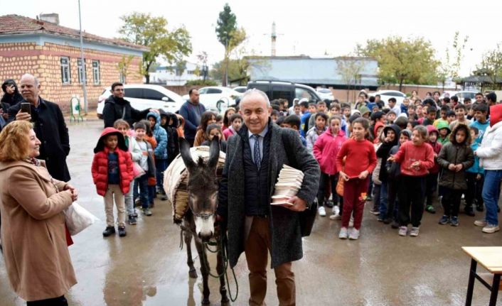 Altaylı Mahallesi’ndeki Altaylı İlk ve Ortaokulu öğrencileriyle bir araya gelen yazar Ersin Bilge, öğrencilere kırtasiye malzemeleri ve dünya klasiklerinden kitaplar hediye etti. Yazar Bilge’nin imza gününe eşekle gelmesi, etkinliğe katılan öğrenci ve katılanlar tarafından şaşkınlıkla karşılandı.