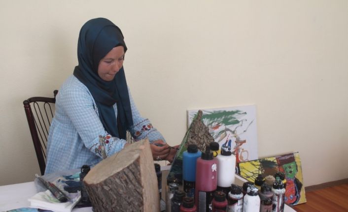 Bayburtlu resim öğretmeni Demet Akbaş, kentin tarihi, kültürel ve doğal değerlerini kütüklere resmediyor.