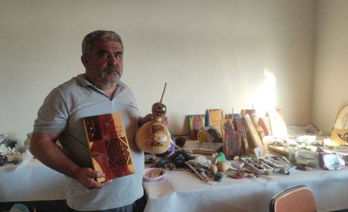 Yozgat’ta kendi imkanlarıyla süsleme sanatını öğrenen köy muhtarı Rıza Taşkın, doğadan topladığı taş, odun ve su kabağını resim ve çeşitli figürlerle süsleyerek sanat eserine dönüştürüyor.