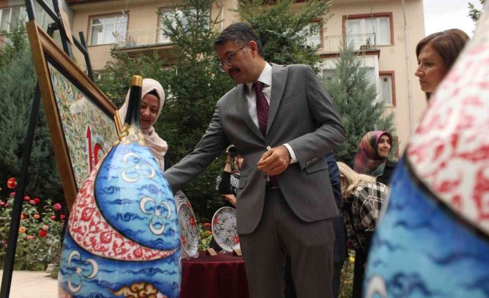 Kütahya Olgunlaşma Enstitüsünün Ispartalılar Konağı’ndaki ‘Kütahya Çinisinde Zafer’in 100’üncü Yılı’ adlı sergide bir araya gelen protokol üyeleri, eserleri yakından incelendi. Usta öğreticilerin tasarımdan üretime kadar çalışmalarını üstlendiği ve nakış nakış işlenen çini eserler, büyük beğeni topladı.