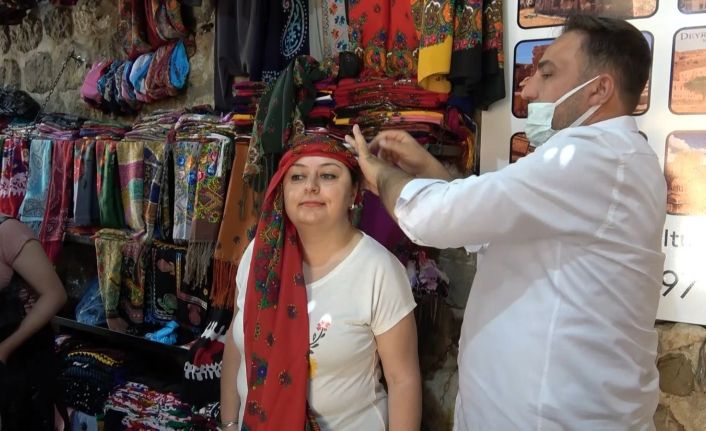 Hafta sonu Mardin’de yaşanan ziyaretçi yoğunluğu ile birlikte kente özgü şal bağlaması turistlerin ilgi odağı oldu.