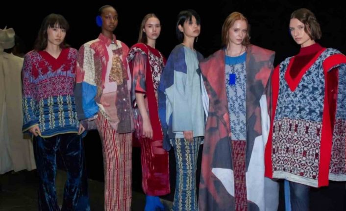 Kutumsu, koruyucu formlar; duygusal sığınaklar oluşturuyor. Devoré kadife kumaşlarla işlenen kırılganlık teması, Türk halılarından esinlenen dokularla geçmişle gelecek arasında bir bağ kuruyor.