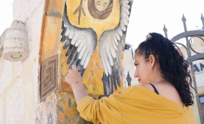 Kapadokya’ya gelen yerli ve yabancı turistlere konaklama hizmeti sunulan kaya oyma otellerin ve restoranların sanatsal anlamda da zengin görsele kavuşması için çalışmalar yapan Ressam Serap Lokmacı, taş duvarlara resim çizerek güzelleştiriyor.