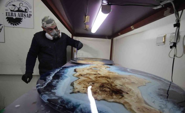 Balıkesir’in Edremit ilçesinde Kazdağları’nın eteklerinde özel izinle kesilmiş zeytin ağaçları ve sanayide yapıştırıcı ve yalıtım malzemesi olarak kullanılan epoksi ile adeta sanat eserleri, masalar, sehpalar ve hediyelik obje üretimi yapıyor.