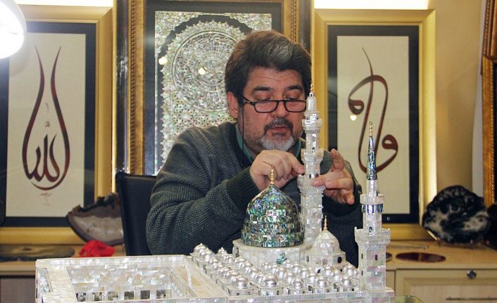 Adana’da hattat Mesut Dikel, atölyesinde 28 bin sedef parçasından Mescid-i Nebevi, 41 bin sedef parçasından da Mescid-i Aksa maketi yaptı. Dikel, Ayasofya-i Kebir Camii Şerifi’nin de sedeften maketini yapmak için çizimlerini bitirdiğini söyledi.
