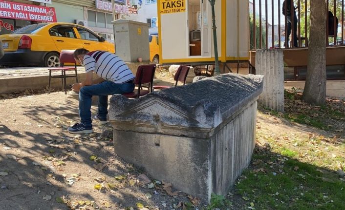 Bursa’nın İznik ilçesindeki Ayasofya Camii bahçesinde kaderine terk edilmiş 2 bin yıllık lahit, taksi durağının bir parçası haline geldi. Burada çay içen esnaf sırtını 2 bin yıllık lahide dayadı.