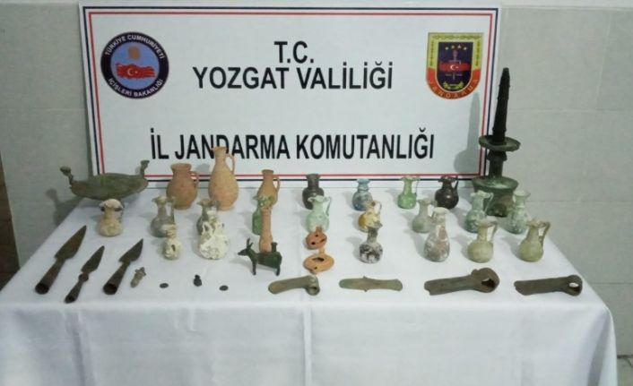 Yozgat İl Jandarma ekipleri, Akdağmadeni ilçesinde bir dinlenme tesisinde içerisinde tarihi eser olduğu ihbarını aldığı aracı durdurdu. Araç içerisinde yapılan aramada değişik dönemlere ait olduğu belirlenen 19 gözyaşı şişesi, 6 adet çömlek, 2 adet sikke, 1 mühür, 1 adet öküz heykeli, 1adet şamdan ve altlığı, 4 adet balta, 3 adet metal ok ucu ve bir adet figür olmak üzere 39 parça tarihi eseri ele geçirdi.