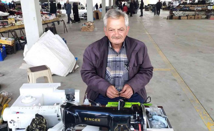 Kütahya’nın Hisarcık ilçe pazarında seyyar dikiş makinesi tamirciliği yapan Bünyamin İpek, 45 yıldan beri mesleğini devam ettiriyor.