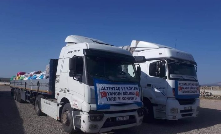Altıntaş Belediye Başkanı Arif Teke, yaptığı açıklamada, ’’Altıntaş ilçemiz yangın bölgelerindeki vatandaşlarımız için tek yumruk olmuştur. Çok kısa sürede 4 tır hayvan yemi ve saman balyası toplanmıştır. İlçe merkezi ve köylerimizden gelen bu yardımlar yola çıkmıştır. Hayırsever Altıntaş halkı her zaman olduğu gibi, birlik ve beraberlik içinde hareket etmiş ve ihtiyaç sahibi vatandaşlarımızın yanında olmuştur. Katkısı olan tüm kardeşlerime teşekkür ediyorum’’ dedi.Altıntaş’tan 4 tır yardım