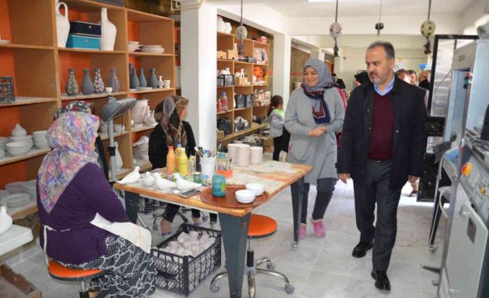 EMKO’nun seramik atölyesini gezen, üretim ve kooperatif hakkında Kooperatif Başkanı Ayşe Er’den bilgiler alan Belediye Başkanı Ali Nur Aktaş, üretilen mamulleri inceleyip örnekler aldı.
