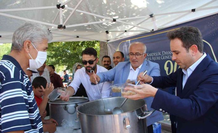 Milletvekili İshak Gazel, Belediye Başkanı Mustafa Güler ve AK Parti İlçe Başkanı Bilal Kıyak kazanların başına geçerek bir süre vatandaşlara aşure dağıttı.