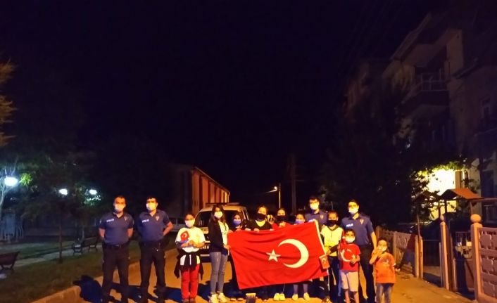 İstasyon Mahallesinde akşam saatlerinde toplanan çocuklar hazırladıkları hediyeler ve şarkılarla polis ekiplerini karşıladılar.