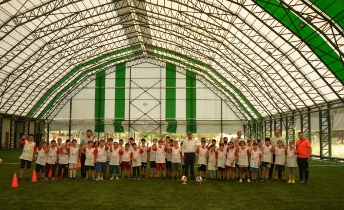 Başkan Akçadurak, Yaz Futbol Okulu’na katılan öğrencilerle ve eğitmenlerle hatıra fotoğrafı çektirdi.