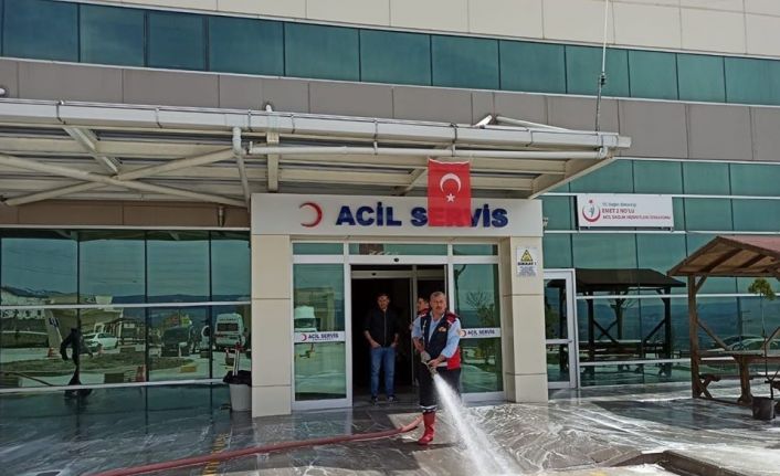 Kütahya’nın Emet ilçesinde Dr. Fazıl Doğan Devlet Hastanesi önü ve çevresi itfaiye ekipleri tarafından dezenfekte edildi.
