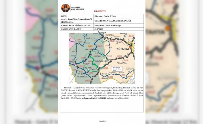 Ulaştırma ve Altyapı Bakanlığı Karayolları Genel Müdürlüğü Hisarcık-Gediz İl Yolu projesi kapsamında 35,9 kilometrelik yol yapım ihalesinin Ağustos ayında gerçekleştirileceği bilgisini verdi.