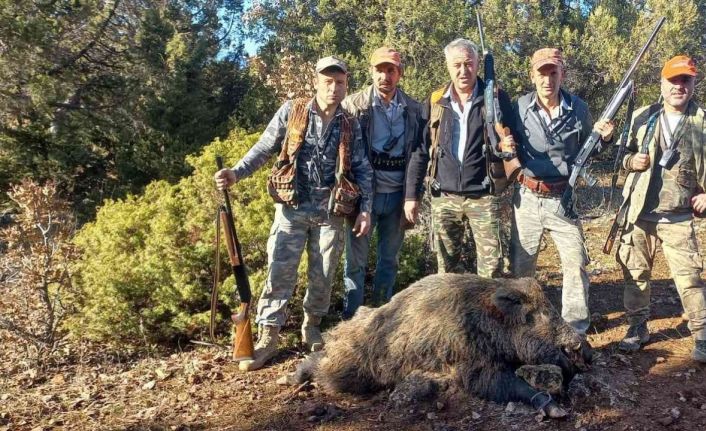 Kütahya’nın Hisarcık ilçesinde avcılar ormanda yaklaşık 350 kiloluk yaban domuzu avladı.