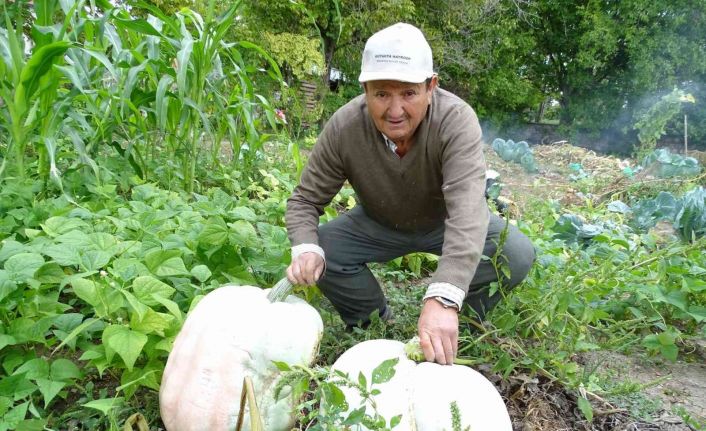 İşçi emeklisi Ali Yılmaz, Mezariçi Mevkii’ndeki tarlasında yerli tohum ve hayvan gübresi kullanarak 25-30 kilo arasında dev bal kabakları yetiştirdi.