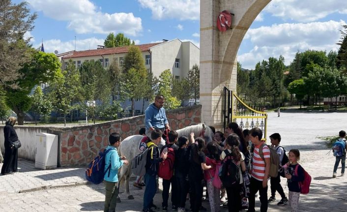 “Paşa” isimli atıyla ilçe merkezinde gezintiye çıkan Süleyman Yolcu, Atatürk İlkokulu önünden geçtiği esnada o anda okuldan çıkan öğrenciler atın etrafını sardı. Öğrencilerin her birinin atı elleriyle okşamaları izleyenlerin yüzünde tebessüm oluşturdu.