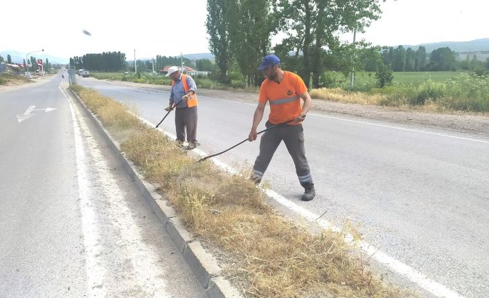 Kütahya’nın Hisarcık ilçesinde Karayolları Yol Bakım ekipleri tarafından Hisarcık-Simav-Emet karayolu kenarları ve orta refüjler yabani otlardan temizleniyor.