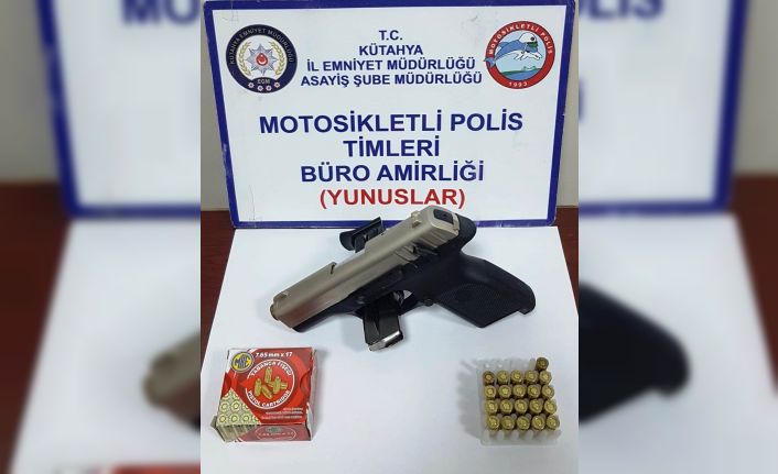 Kütahya’da motosikletli polis timlerince bir araçta yapılan aramada, ruhsatsız tabanca ve 21 fişek ele geçirildi.