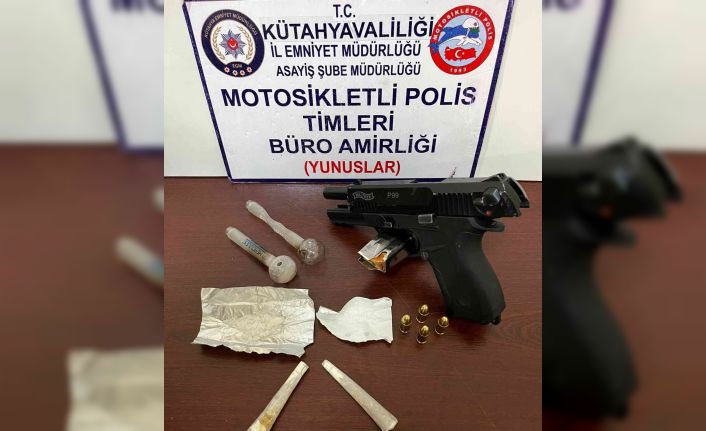 Kütahya’da Yunus Timlerince bir araçta yapılan aramada, 1 adet ruhsatsız tabanca, 4 adet fişek 2.72 gram metamfetamin ve 3.27 gram tütünle karıştırılmış esrar ele geçirildi.