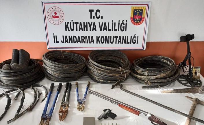 Kütahya İl Jandarma Komutanlığı ve Tavşanlı İlçe Jandarma Komutanlığı ekiplerince yapılan çalışmalar neticesinde, M.Y. isimli şahsın izinsiz kazı yapmak suretiyle temin etmiş olduğu tarihi eser niteliğindeki malzemeler ile çalıntı kabloları ikamet adresinde muhafaza ettiği bilgisine ulaşıldı. Şahsın evinde yapılan aramada, 100 metre bakır haberleşme ve nakil enerji kablosu, 3 adet demir, kablo kesme makası, 1 adet define arama detektörü, 1 adet ruhsatsız tabanca, 1 adet ruhsatsız av tüfeği, 20 gram kenevir tohumu, 1 adet hassas terazi ve 5 adet tabanca fişeği ele geçirildi.