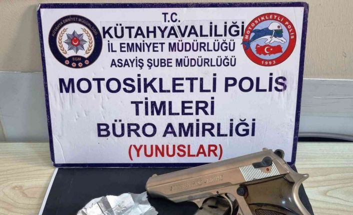 Kütahya’da Motosikletli Polis Timleri Amirliği ekiplerince, durumundan şüphelenilerek durdurulan iki kişinin bulunduğu motosiklette ve kişilerin üzerinde yapılan aramada silah ve uyuşturucu madde ele geçirildi.