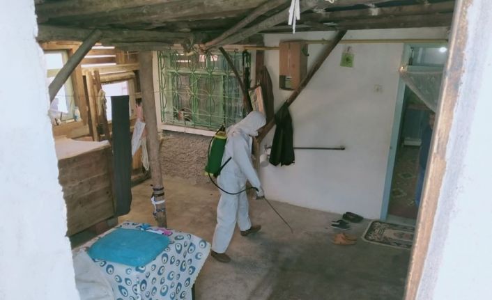 Muhtar mahallesinde her evi dezenfekte ediyor