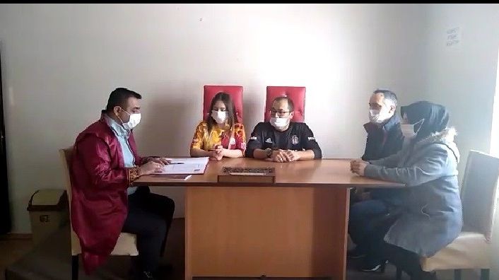 Sosyal mesafe kuralı gözetilerek kıyılan nikahlarda çiftlerin yakınları ise salon dışına kurulan ekrandan nikah anını izleyebiliyor.