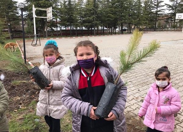 Domaniç Çamlıca İlkokulu bahçesinde yapılan fidan dikim etkinliğinde öğrenciler karaçam fidanlarını toprakla buluşturdu.